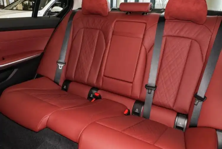 Os materiais internos são sólidos e refinados, com amplo uso de revestimento Sensatec, complementado por acabamentos metálicos ou em madeira. Versões superiores oferecem acabamento em fibra de carbono e elementos internos com efeito cristal, reforçando o ambiente premium. A espessura das almofadas dos bancos aumentou em 5 mm, melhorando o conforto. A versão padrão prioriza suporte lateral, enquanto a versão alongada oferece espaço traseiro superior a dois punhos de distância, com ajustes em múltiplos ângulos.