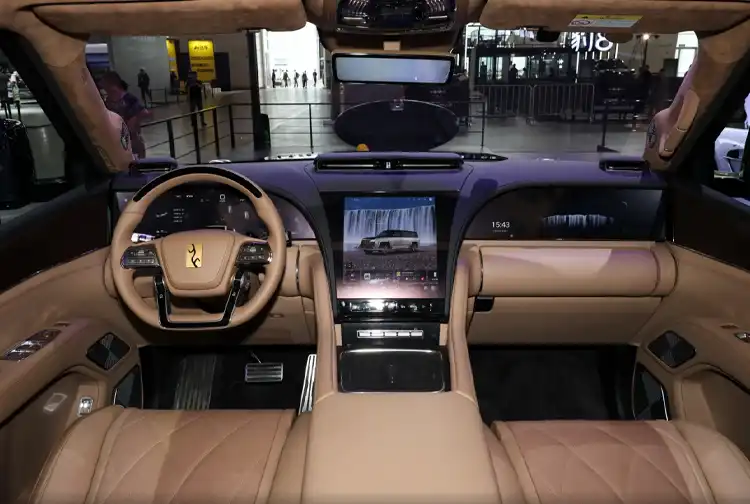 Materiais de alta qualidade dominam o interior: amplas superfícies em couro, acabamento em madeira natural e costuras refinadas no painel e nas portas transmitem sensação de artesanato e exclusividade. Um sistema de interação com múltiplas telas permite que os passageiros traseiros controlem determinadas funções do veículo por comando de voz, reforçando a conveniência e a experiência tecnológica.