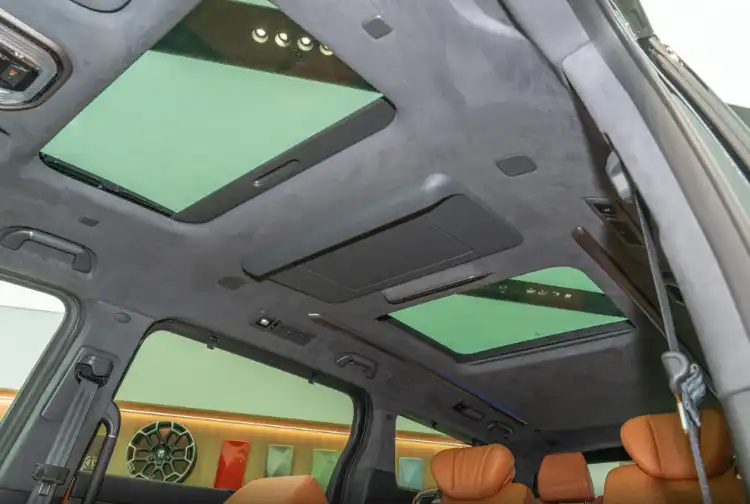 Os bancos dianteiros são revestidos em couro Nappa, com funções de ventilação, aquecimento e massagem. Há cortinas manuais nas janelas da segunda e terceira fileira, além de um compartimento climatizado de 12,5 litros e uma tela traseira de 17,3 polegadas em resolução 3K para entretenimento dos passageiros.