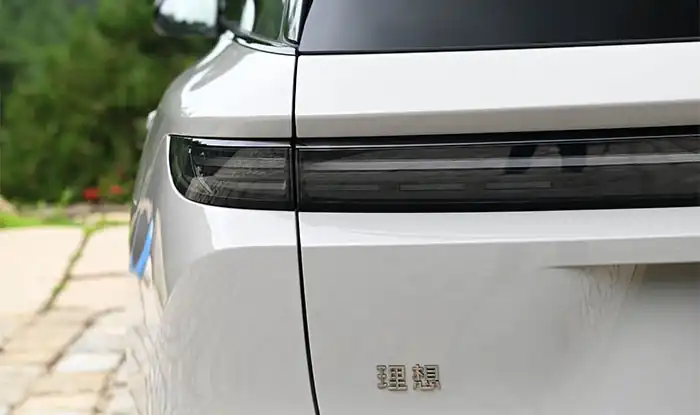 A traseira do Li i6 equilibra função e impacto visual. As luzes em toda a largura com relevo 3D dialogam com o anel luminoso frontal através de guias de luz interna, proporcionando alta identificação noturna. O vidro traseiro inclinado integra-se com o spoiler do tejadilho, e o para-choques inferior em estilo difusor melhora a aerodinâmica e a postura coupé. As linhas côncavas da mala criam profundidade e a remoção do suporte tradicional da matrícula simplifica o visual. A luz de travão elevada em faixa vertical aumenta a segurança e sublinha a sofisticação tecnológica.