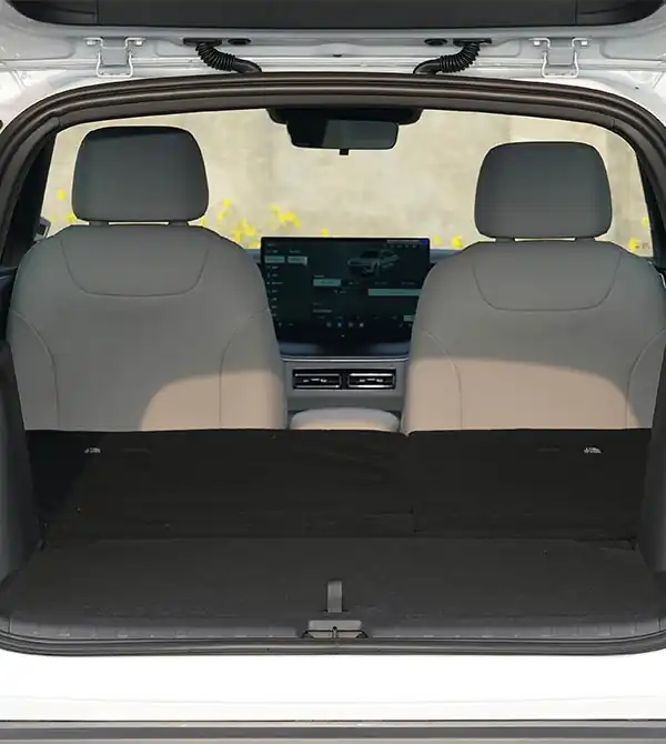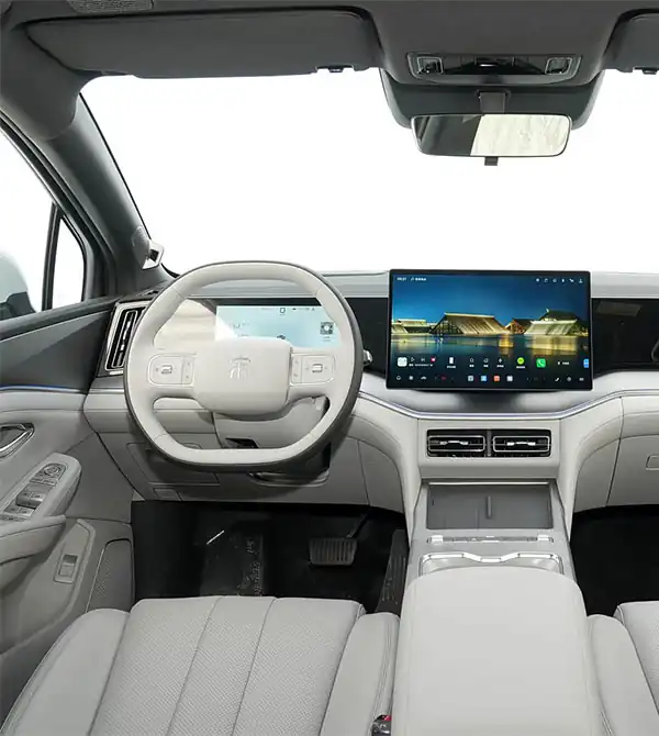 Ao entrar no interior, fica evidente o posicionamento central do modelo: conforto para uso familiar. O habitáculo é amplamente revestido com materiais macios ao toque, combinados com detalhes metálicos e a opção de teto em suede, criando um ambiente sofisticado e acolhedor, com excelente sensação tátil — totalmente alinhado às necessidades de um SUV familiar. O layout do painel é organizado, sem exageros tecnológicos como telas curvas desnecessárias. O painel de instrumentos digital de 12,3 polegadas, combinado com a tela central flutuante de 15,6 polegadas, oferece operação clara e intuitiva. O seletor de marchas eletrônico na coluna de direção permite ao motorista trocar de marcha sem tirar os olhos da estrada, tornando a condução mais prática e segura.