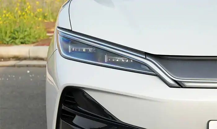 No exterior, o novo modelo continua a linguagem de design “Dragon Face” característica da linha Dynasty, mas recebeu melhorias mais alinhadas à sua natureza elétrica, elevando ao máximo o nível de reconhecimento. A dianteira fechada, combinada com um painel preto com o caractere “Song” em destaque, permite identificar de imediato sua identidade elétrica — simples, elegante e com um toque de estética chinesa, sem excessos decorativos. Os faróis achatados em ambos os lados se conectam à faixa luminosa superior formando um conjunto contínuo; quando acesos à noite, o efeito tecnológico é marcante. A entrada de ar inferior adiciona um toque esportivo, trazendo mais dinamismo a uma frente originalmente mais sóbria. Vale destacar que o modelo oferece como opcional o LiDAR; com ele instalado, um módulo visível no teto não só melhora as capacidades de condução inteligente, como também reforça o visual futurista e a presença nas ruas.