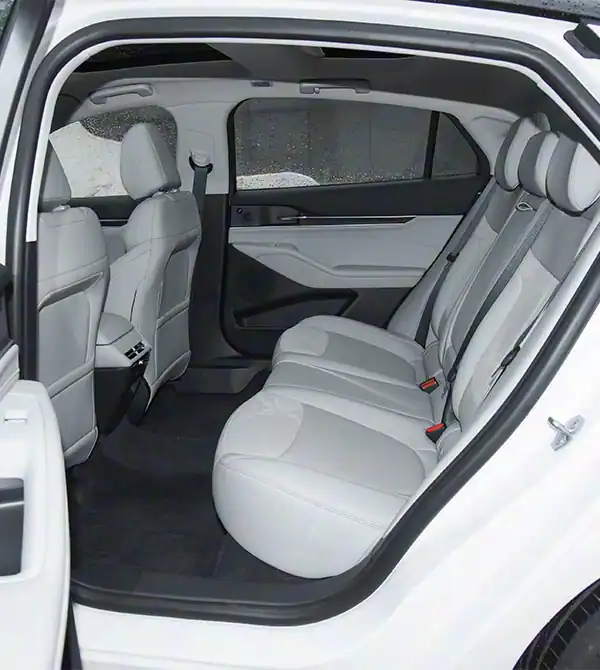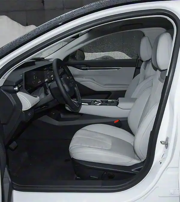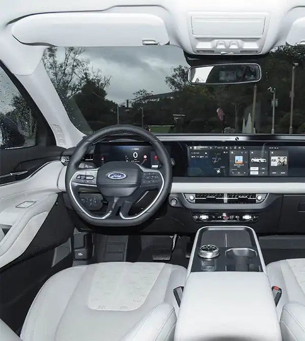 A cabine interna segue o layout clássico em formato “T”. O elemento mais chamativo é a tela ultralarga de 1,1 metros composta por painel digital de 12,3 polegadas e uma tela touchscreen 4K de 27 polegadas, oferecendo uma experiência visual superior à maioria dos concorrentes japoneses e alemães. O sistema multimídia Ford SYNC+ 5.0 com chip Snapdragon 8155 garante uma operação rápida e fluida. Materiais macios e acabamentos em couro são amplamente aplicados no interior, enquanto a versão 2.0T recebe bancos mistos em couro e camurça com costura refinada. O entre-eixos de 2945mm permite que o espaço para as pernas traseiras chegue a 1008mm, acomodando confortavelmente passageiros de até 1,80m com sobra. O assoalho traseiro plano aumenta conforto para o passageiro central, e os bancos rebatíveis permitem ampliar o volume de carga conforme necessário.
