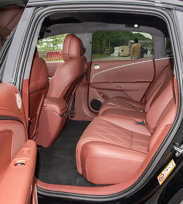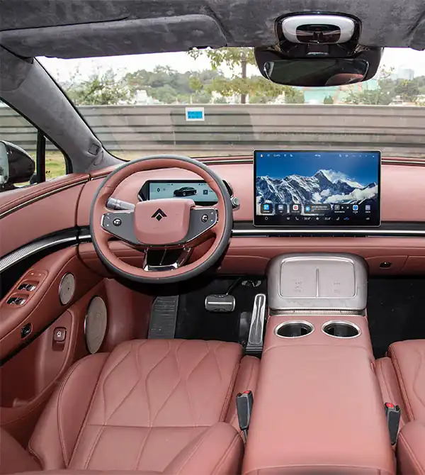 Ao entrar no interior, o layout de cabine envolvente, combinado com iluminação ambiente em anel e design sem luz principal, cria uma atmosfera luxuosa, silenciosa e confortável para motorista e passageiros. O estilo geral é simples, elegante e cheio de personalidade. Em termos de tecnologia inteligente, o Hyptec A800 2026 é equipado com o cockpit HarmonySpace 5 da Huawei, com uma tela central de 14,6 polegadas com resolução 2.5K e um painel de instrumentos totalmente digital de 10,25 polegadas, além da opção de um head-up display W-HUD de 27 polegadas. A interação entre as três telas proporciona uma experiência fluida e prática. A lógica do sistema é semelhante à de smartphones, tornando o uso intuitivo e fácil de aprender, com resposta rápida e eficiente. O entre-eixos extra-longo de 3020 mm estabelece uma base sólida para o espaço interno; mesmo passageiros com 185 cm de altura, após ajustar a posição de condução, ainda têm mais de um punho de espaço livre acima da cabeça, garantindo conforto e sensação de amplitude.