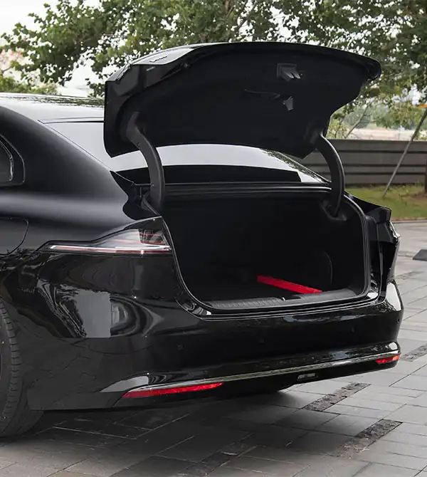 Na parte traseira, o design continua o estilo minimalista e tecnológico da dianteira, com o foco visual concentrado no conjunto de lanternas contínuas. O interior das lanternas recebe acabamento escurecido, e o design em três segmentos é inspirado nas trilhas de condensação deixadas por jatos no céu. As três camadas de luz se acendem gradualmente, criando um efeito visual rico e altamente reconhecível à noite. O pequeno spoiler tipo “ducktail” elevado não apenas melhora o desempenho aerodinâmico, fornecendo maior pressão descendente em altas velocidades e aumentando a estabilidade, como também adiciona um toque esportivo e ágil à traseira elegante. A parte inferior adota um layout de escapamento duplo oculto em ambos os lados, combinado com um para-choque traseiro simples e bem definido, resultando em um visual discreto, sofisticado e de alta qualidade.