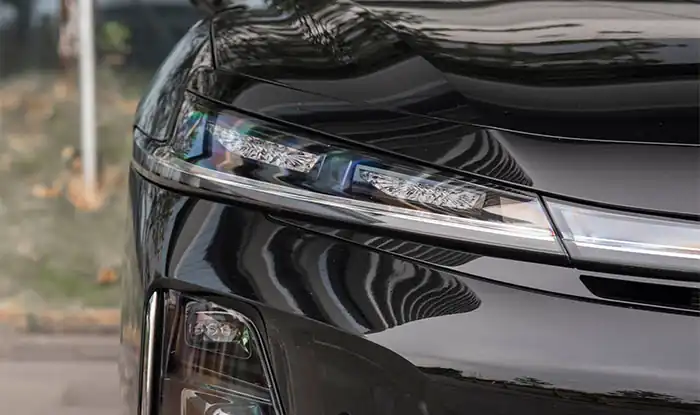 O GAC Hyptec A800 2026 rompe completamente com os padrões tradicionais no design exterior, criando uma experiência visual inesquecível com uma dianteira extremamente inovadora. O novo modelo adota uma frente fechada, combinada com os primeiros faróis rotativos tridimensionais do mundo. O acabamento interno do conjunto óptico é refinado e harmoniza perfeitamente com as proporções do veículo, formando uma postura baixa, dinâmica e com linhas longas e fluidas. O elemento mais marcante da dianteira é a faixa de LED contínua em forma de anel estelar com 2,1 metros de comprimento. Quando acesa à noite, o alcance adaptativo dos faróis alto e baixo pode chegar a 230 metros, reforçando a segurança na condução e oferecendo ao mesmo tempo um forte impacto visual. Os faróis divididos nas laterais também suportam interação inteligente por meio de efeitos de iluminação, exibindo um fluxo de luz semelhante ao número “7” durante a ativação dinâmica, o que aumenta ainda mais a segurança noturna e a atmosfera tecnológica.