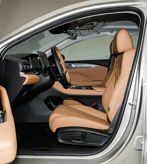 O design lateral do corpo do carro também esconde engenhosidade. Com comprimento de 4806mm e largura de 1886mm, ele tem uma postura mais espaçosa do que os concorrentes. Aliado a uma distância entre eixos superlonga de 2756mm, ele se classifica diretamente na categoria compact+ . O elemento mais chamativo é a linha de cintura branca flutuante de comprimento total que se estende da frente à traseira do carro, que sobe levemente na porta. Ele delinea uma postura ágil por meio do entrelaçamento de linhas virtuais e reais, reduzindo efetivamente o centro de gravidade visual. O design das janelas também é bastante distintivo: o pilar B oculto combinado com um quadro estreito cria um efeito visual de teto flutuante transparente, ao mesmo tempo que proporciona uma visão interior mais ampla, elevando ainda mais o senso de luxo do veículo inteiro. Vale mencionar que o corpo do carro usa tinta de marcas internacionais de primeiro nível, com toque delicado e suave e maior resistência a arranhões.
