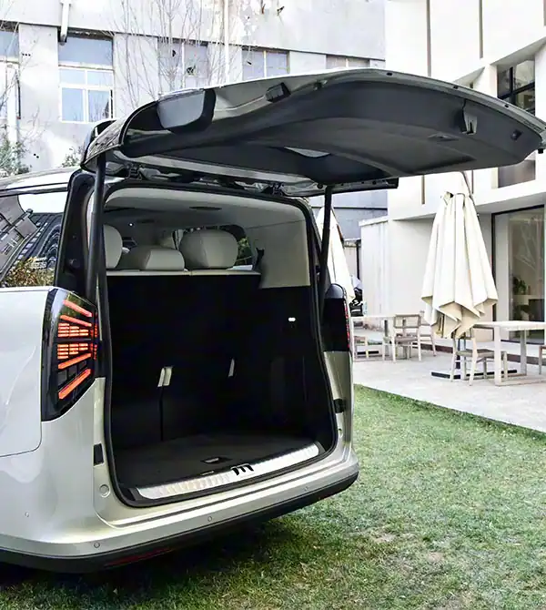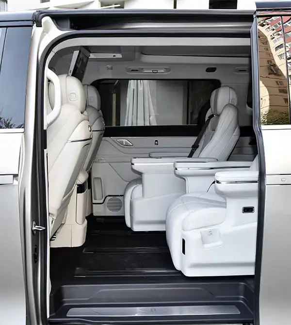 Em termos de dimensões, o Geely Galaxy V900 oferece um desempenho esmagador — mede 5360 mm de comprimento, 1998 mm de largura e 1940 mm de altura, com uma distância entre eixos que ultrapassa 3200 mm, superando completamente seus concorrentes da mesma categoria, como o Denza D9 e o Li Auto MEGA. O maior tamanho proporciona um espaço interior mais amplo. O design de carroceria bicolor não apenas aumenta a profundidade visual, mas também otimiza ainda mais a taxa de utilização do espaço em combinação com o design de piso plano. A altura vertical interior do veículo atinge 3 metros, permitindo que os passageiros das filas dianteiras e traseiras desfrutem de uma experiência de viagem espaçosa e confortável, eliminando completamente a sensação de restrição.