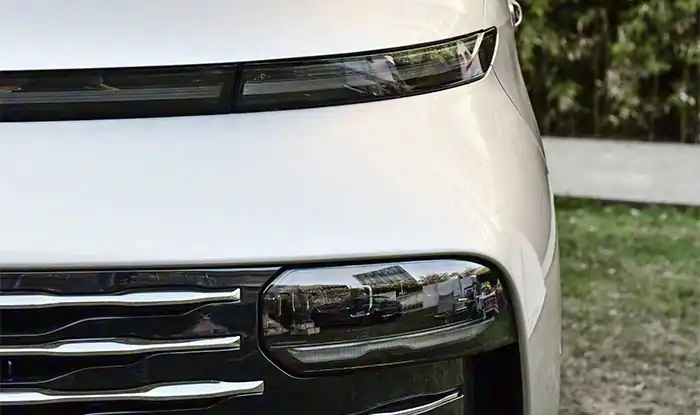 A frente do Geely Galaxy V900 é um destaque visual, cuja inspiração de design vem diretamente da silhueta elegante de iates de luxo. A grade de entrada de ar cromada com múltiplas barras horizontais, semelhante às linhas do convés de um iate, se estende com grande potência e reflete um brilho resplandecente sob o sol, transmitindo instantaneamente uma forte sensação de luxo e um impacto visual impressionante. Os faróis diurnos LED contínuos, como a primeira luz do amanhecer, ecoam inteligentemente o logotipo tridimensional "Tianma" (Cavaleiro Celestial), aumentando enormemente o reconhecimento da frente. É importante destacar que o logotipo de ouro de 24K e o emblema de coleção exclusivos da versão top de linha elevam o temperamento nobre ao limite, com cada detalhe que destaca o gosto e a posição do proprietário.