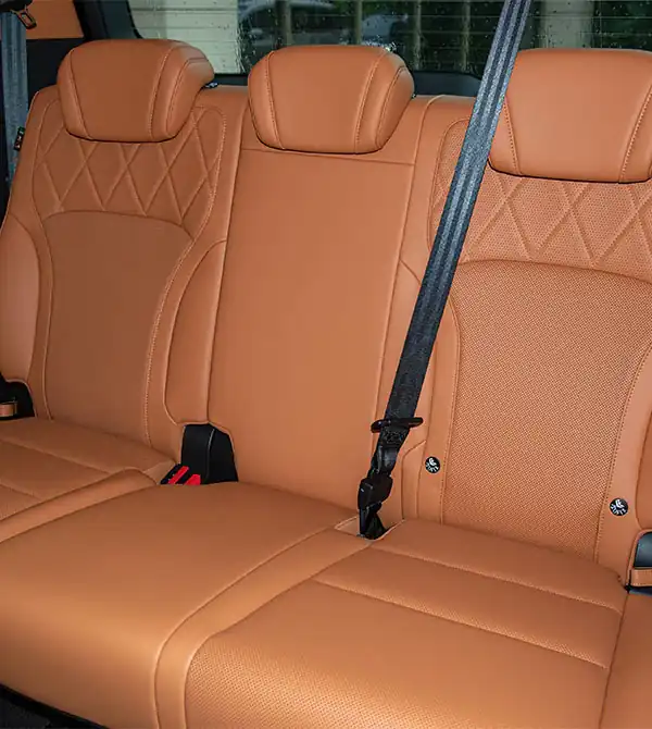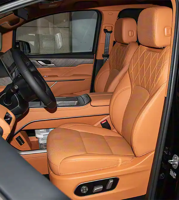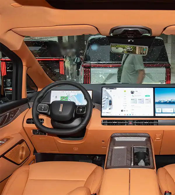 No habitáculo, o cluster totalmente digital de 12,3 polegadas, as duas telas centrais de 15,6 polegadas e o HUD de 26 polegadas formam um sistema multi-telas interconectado. O veículo conta com o Coffee OS 3.2 em um chip da série 8295 e suporta Coffee GPT para interação vocal natural, garantindo operação fluida e resposta rápida. Sistema de áudio de 23 alto-falantes (pico 2.450 W), bancos em couro Nappa com massagem e ventilação, e combinações de cor como Nuvem Branca e Laranja Alvorada criam um ambiente de luxo. Os assentos independentes da segunda fila incluem apoios de braço duplos, mesas dobráveis e tela 3K de 17,3 polegadas; o modo gravidade zero com um toque proporciona uma experiência de assento “flutuante”. O refrigerador de 12,5 L suporta controle térmico de −6 °C a 50 °C, ideal para conservação de produtos infantis ou alimentos de acampamento. O espaço para pernas na segunda fila mede mais de 1 metro; aliado ao áudio 7.1.4, transforma o interior em um cinema móvel de luxo. A terceira fila tem rebatimento 4/6 e encosto regulável; o piso otimizado facilita o embarque. Mesmo sendo classificado como MPV compacto, o entre-eixos de 3.085 mm garante folga para os joelhos de adultos e oferece saídas de ar e portas USB individuais para máximo conforto.