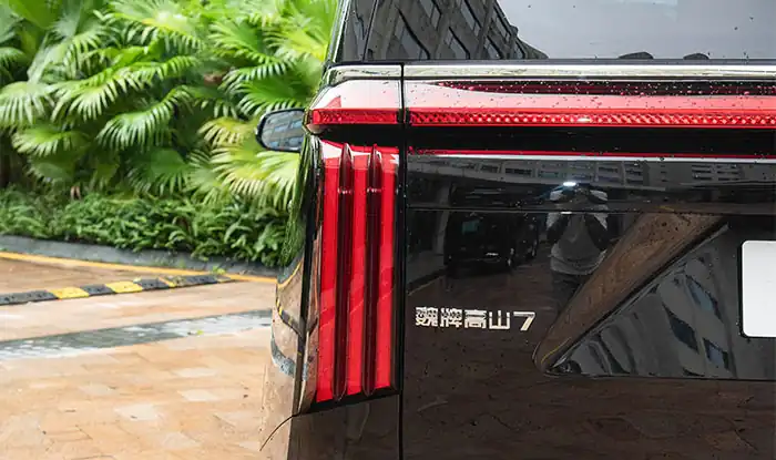 Na traseira, a lanterna escurecida em largura total estende-se até os para-lamas e amplia visualmente a estampa. O friso cromado no para-choque traseiro ecoa o desenho frontal; com a redução de ornamentos redundantes, as linhas ficam mais limpas e objetivas. Embora o porta-malas em configuração normal comporte sete malas de 20 polegadas (cinco a menos que o Gaoshan 8), um compartimento rebaixado de armazenamento compensa essa diferença de forma inteligente, atendendo ao perfil pragmático das famílias que valorizam “o suficiente, sem desperdício”.