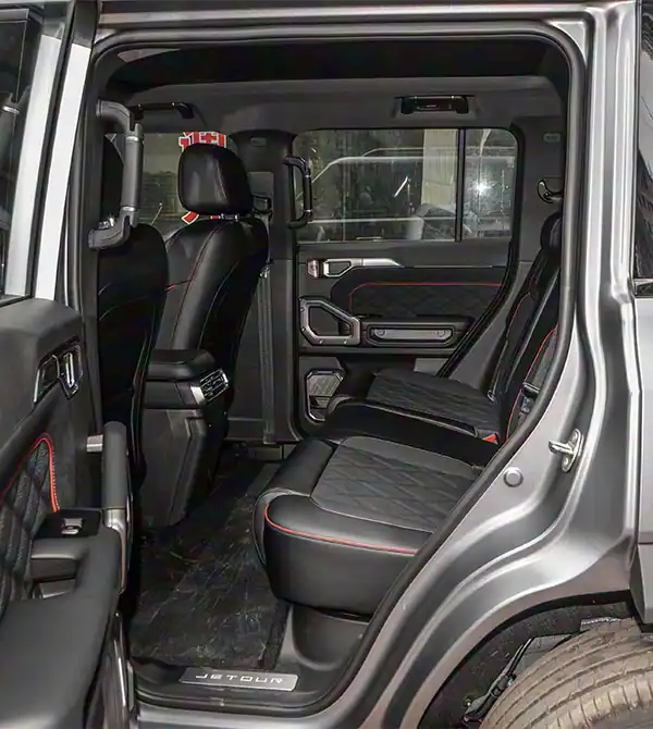 O Jetour Traveler C-DM 2026 1.5TD DHT 211km XWD Conqueror mantém a forma clássica de caixa com detalhes aprimorados para sensação mais premium. A grade tridimensional ampla e as luzes de destaque escurecidas aumentam a sofisticação, e agora o Deep Sea Blue está disponível. Novas rodas de liga e estribos laterais mais largos melhoram a praticidade, enquanto o para-choque traseiro apresenta detalhes em preto brilhante. A versão Road Gray oferece pintura mate exclusiva, lanternas traseiras verticais transparentes e estepe externo, unindo robustez com estilo contemporâneo.