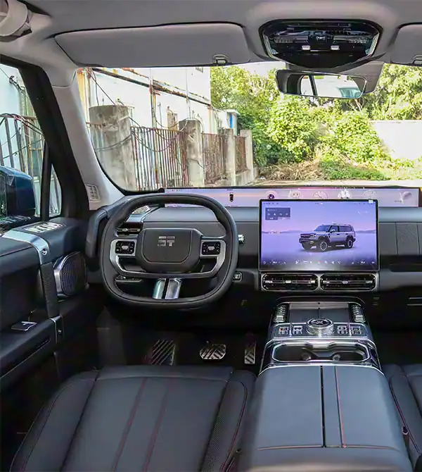 O interior combina robustez e sofisticação. O painel digital de 35,4” e a tela central de 15,6” formam o núcleo tecnológico. Três opções de cores — laranja, bege e cinza — com couro Nappa e costuras em losango criam um ambiente luxuoso. O botão de cristal e os comandos físicos centralizam o controle da tração 4×4 e do bloqueio de diferencial.
