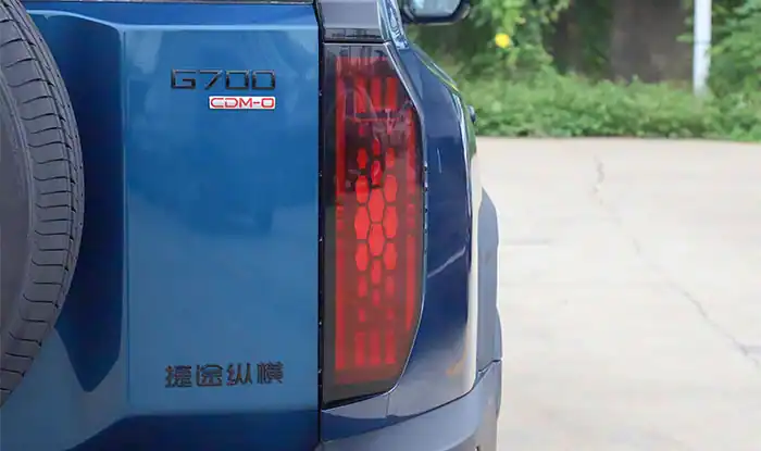 De perfil, o G700 mantém o estilo quadrado típico dos SUVs off-road. Com 5198 mm de comprimento e 2050 mm de largura, transmite imponência. A distância entre-eixos de 2870 mm garante amplo espaço traseiro e raio de giro de 5,8 m. O teto flutuante e as rodas bicolores de 20” equilibram o design, enquanto os pneus 275/60R20 e as luzes verticais nos para-lamas reforçam o caráter aventureiro. O chassi exposto demonstra sua verdadeira essência off-road. Os frisos laterais com o emblema G700 unem proteção e identidade, enquanto as linhas fortes e a suspensão a ar com ângulo de ataque de 21° permitem desempenho excepcional tanto na cidade quanto em trilhas.