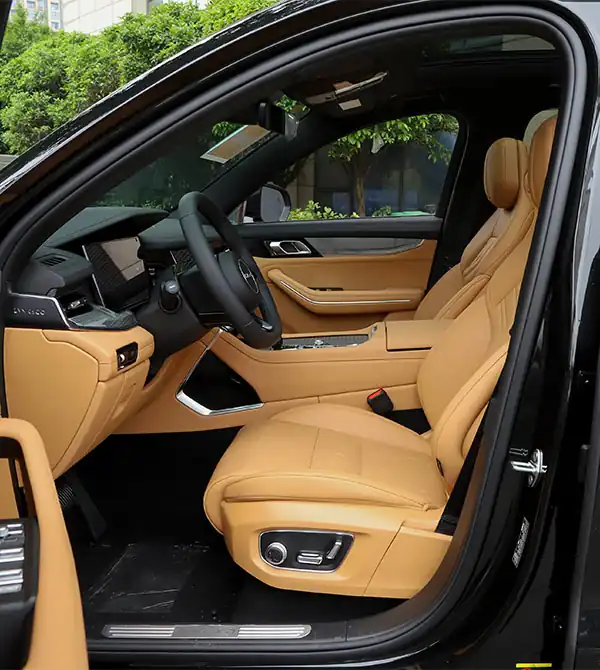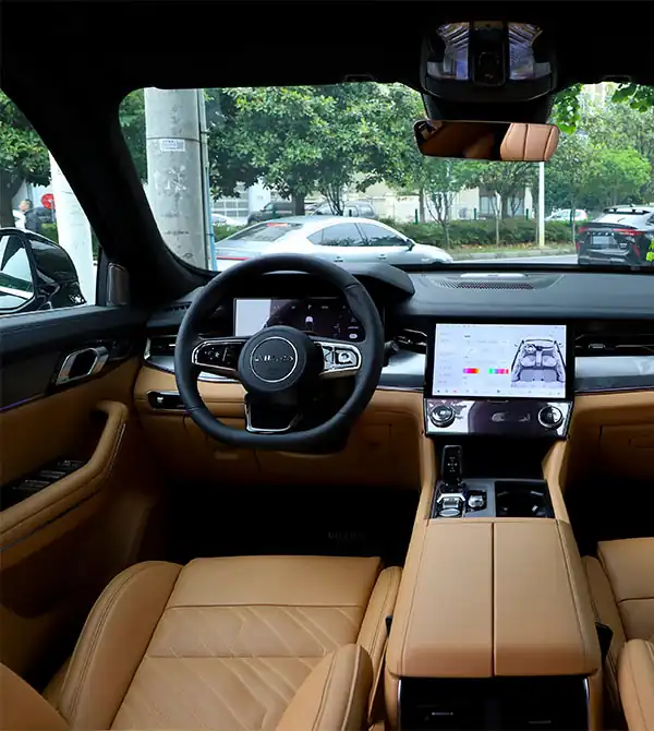O interior combina o minimalismo escandinavo com o requinte oriental. O painel em formato T abriga uma tela central de 12 polegadas e um painel digital de 12,3 polegadas, ambos impulsionados pelo chip Qualcomm Snapdragon 8155. O acabamento em couro Nappa com costura dupla, detalhes metálicos e iluminação ambiente com gravação a laser criam uma sensação de profundidade e elegância.