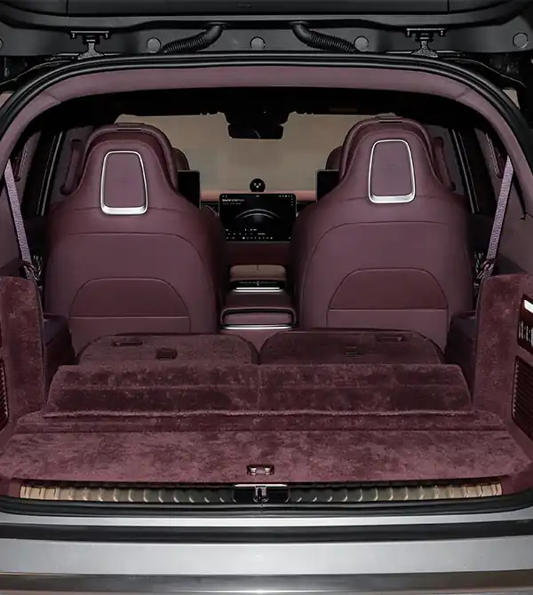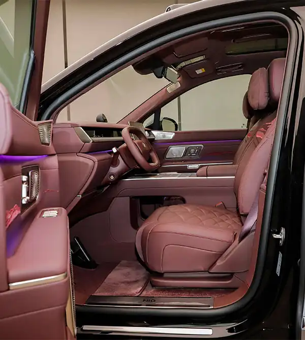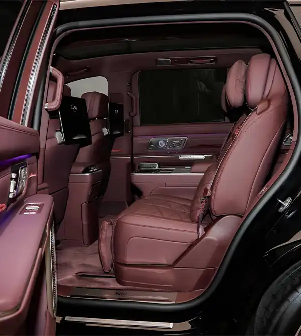 A cabine também estreia janelas inteligentes com escurecimento LC em matriz, com a velocidade de transição mais rápida do setor, permitindo alternar rapidamente entre modos transparente e privado conforme necessário, equilibrando iluminação e privacidade. A ilha executiva inteligente é outro destaque, equipada com duas telas exclusivas de 16 polegadas, sistema de videoconferência em alta definição e uma mesa de chá magnética dedicada, tornando o trabalho móvel e a recepção de negócios mais elegantes e eficientes, reforçando o caráter executivo do veículo.