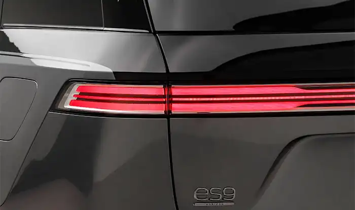 Nos detalhes, o NIO ES9 equilibra minimalismo e tecnologia: a linha inferior das janelas é reta, combinada com acabamentos ocultos de vedação, maçanetas embutidas e estribos elétricos, reduzindo a resistência aerodinâmica e tornando as linhas mais fluidas. Os retrovisores externos também deverão contar com luz azul AD, criando harmonia visual com as luzes dos para-lamas. Na traseira, mantém-se a faixa contínua SuperRed em LED, combinada com detalhes acetinados e acabamento metálico escovado, criando uma sensação de qualidade em camadas. O limpador traseiro oculto e os vidros traseiros com privacidade não apenas elevam o nível de sofisticação, como também garantem maior privacidade aos passageiros. Em termos de dimensões, com 5365/2029/1870 mm (comprimento/largura/altura) e entre-eixos de 3250 mm, o ES9 oferece um espaço interno extremamente amplo, eliminando completamente a ansiedade por espaço típica dos SUVs grandes.