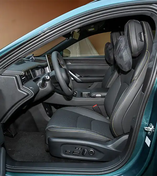 Ao entrar no interior, o SAIC Z7T oferece uma cabine inteligente e luxuosa no estilo shooting brake, proporcionando uma experiência confortável em todos os cenários de uso. O veículo é equipado com painel digital completo de 12,3 polegadas, uma tela central retrátil e rotativa de quatro dimensões (estreia mundial), vitrine criativa para o passageiro dianteiro e telas duplas de entretenimento traseiras, criando um espaço imersivo de interação inteligente. O sistema multimídia utiliza o HarmonyOS Cockpit 4.0, com chip Qualcomm 8295P integrado, suportando rede 5G, controle de voz em seis zonas, diálogo contínuo, atualizações OTA completas e integração entre smartphone e veículo, oferecendo operação extremamente fluida e uma experiência de interação homem-máquina de alto nível. Em termos de espaço, a distância entre eixos de 3000 mm, combinada com o piso totalmente plano, proporciona um desempenho acima da categoria: mesmo passageiros com 185 cm de altura têm espaço suficiente — cerca de um punho acima da cabeça na frente, dois punhos para as pernas atrás e um punho para a cabeça — sem sensação de aperto mesmo com cinco ocupantes. Em capacidade de armazenamento, o porta-malas oferece 620 litros em condição normal, podendo expandir até 1694 litros com os bancos traseiros rebatidos, atendendo plenamente às necessidades de uso diário e viagens longas.
