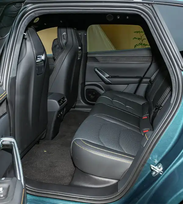 A lateral da carroceria é o melhor reflexo da alma shooting brake do SAIC Z7T. O ângulo dourado de 24 graus da coluna permite que a linha do teto se estenda suavemente a partir do pilar B até a traseira, onde se fecha naturalmente em queda, desenhando perfeitamente a elegante silhueta fastback típica desse tipo de veículo. Ainda mais notável é que esse design fluido não compromete o espaço interno, mantendo um amplo espaço para a cabeça dos passageiros traseiros. Os detalhes da carroceria demonstram alto nível de acabamento: portas sem moldura com fechamento elétrico e abertura por toque elevam o nível de luxo e tornam o uso diário mais prático. As rodas pretas de 20 polegadas com design de cinco raios duplos, combinadas com pneus largos (245 na dianteira e 275 na traseira) e pinças de freio Brembo amarelas chamativas, elevam a atmosfera esportiva ao máximo. Os retrovisores externos com design flutuante integram área NFC, câmeras laterais e luz indicadora de condução inteligente, combinando tecnologia e funcionalidade.