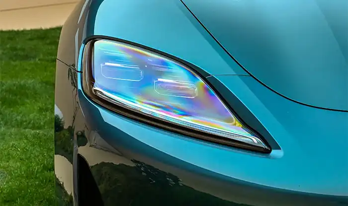 O design frontal do SAIC Z7T demonstra ao máximo o caráter esportivo inerente a um shooting brake. A carroceria alongada de 5036 mm, combinada com a largura ampliada de 1976 mm, cria uma postura visual baixa e larga cheia de tensão, transmitindo uma presença imponente sem esforço. A dianteira adota o característico design fechado dos veículos elétricos, com um estilo geral simples e limpo; duas linhas marcantes no capô se estendem para frente e se conectam perfeitamente com os faróis, reforçando ainda mais a sensação de unidade e força. O sistema de iluminação é o destaque da dianteira: os faróis de “fluxo urbano” utilizam um acabamento em cristal brilhante, com 302 pontos luminosos gravados a laser no interior, lembrando uma galáxia em movimento, oferecendo tanto uma sensação translúcida e dinâmica quanto uma altíssima reconhecibilidade. As luzes diurnas superiores e inferiores adotam um design em camadas, e no momento em que se acendem, a atmosfera tecnológica do veículo é elevada ao máximo.