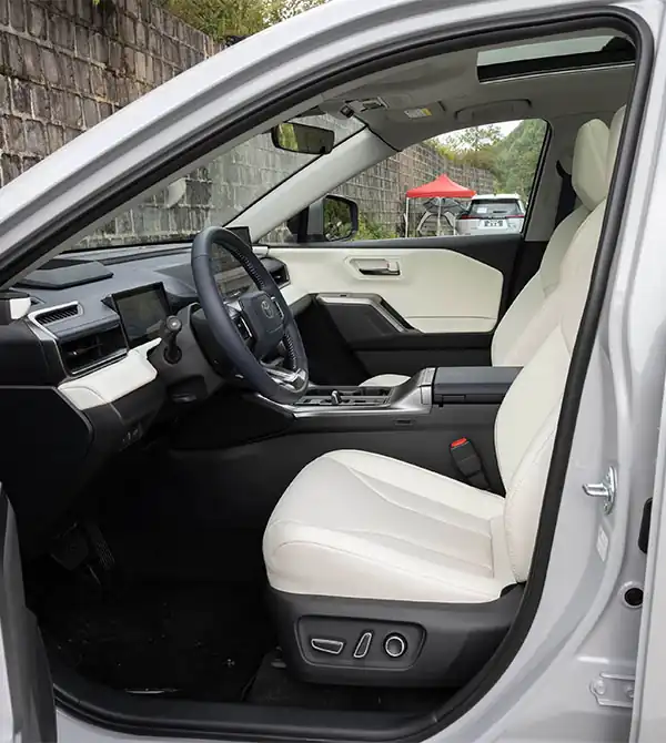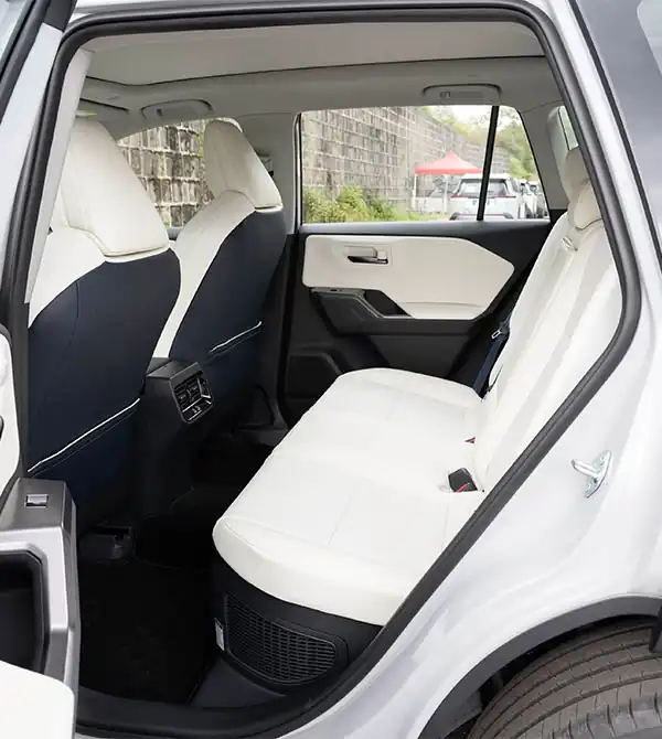 O perfil lateral enfatiza força e dinamismo. As linhas elevadas do capô e os para-lamas alargados criam uma sensação muscular, enquanto a linha de cintura em forma de “Y”, inspirada no conceito do Land Cruiser elétrico, gera uma postura inclinada para frente. As novas rodas de até 20 polegadas aumentam o impacto visual em relação às antigas de 19. As dimensões (4600/1855/1680 mm; entre-eixos de 2690 mm) garantem excelente manobrabilidade urbana. A janela traseira lateral otimizada melhora a visibilidade, enquanto as opções de carroceria em duas cores — como teto preto + branco pérola platina — reforçam a elegância e apelo jovem. A cor da carroceria muda conforme a luz, criando um efeito visual marcante.