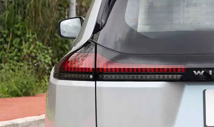 A traseira mantém um estilo simples com linhas horizontais que ampliam a sensação de largura. A faixa de LED que atravessa toda a traseira combina com o design dianteiro e usa pontos luminosos internos que brilham como néon à noite. Um pequeno spoiler no teto integra a luz de freio superior, e o vidro traseiro inclinado melhora a aerodinâmica. O para-choque inferior tem proteção resistente a arranhões, refletores, luz de ré e espaço para gancho de reboque. Cada detalhe prioriza funcionalidade e segurança, refletindo o caráter prático de um SUV familiar.