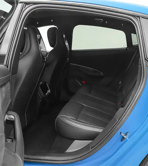 A traseira dialoga com a dianteira, sendo o conjunto de lanternas contínuas em forma de halo o principal destaque. A estrutura interna foi otimizada para criar uma iluminação uniforme e suave, garantindo alta visibilidade à noite. Também conta com função de seta dinâmica, reforçando a sofisticação dos detalhes. O teto traz um aerofólio traseiro elétrico retrátil, que se eleva automaticamente em altas velocidades, melhorando a aerodinâmica e a estabilidade, além de reforçar o caráter esportivo. O para-choque traseiro adota um design esportivo, com dutos de ar nas laterais e difusor na parte inferior, intensificando a atmosfera de coupé. O difusor, otimizado em túnel de vento, aumenta a pressão aerodinâmica em alta velocidade, tornando a condução mais estável e precisa.