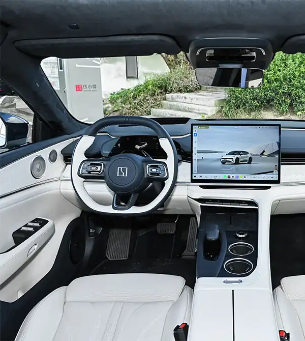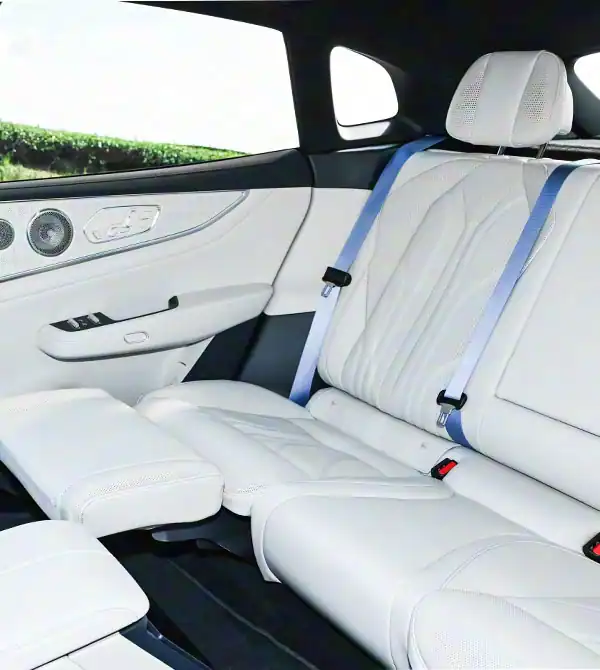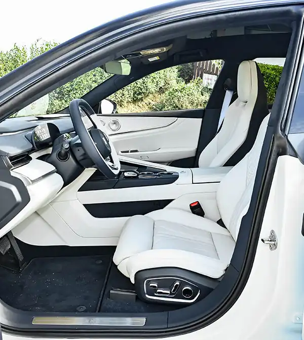 Por dentro, o Zeekr 001 2026 exala luxo com couro NAPPA de Mônaco e painéis com padrão pied-de-poule. O ecrã rotativo de 15,05 polegadas e o AR-HUD de 35,5 polegadas proporcionam uma experiência tecnológica envolvente. O teto estrelado com 500 pontos luminosos permite projeções de constelações e efeitos dinâmicos, enquanto o sistema de som ZEEKR Sound Max (29 alto-falantes + 8 subwoofers nos bancos) transforma o interior numa verdadeira sala de concertos. Os bancos traseiros reclináveis até 125° com apoio de pernas ajustável equilibram conforto e espaço. O acabamento em Alcantara e os bancos ventilados/aquecidos elevam a sensação premium, enquanto o ecrã traseiro independente aumenta o conforto.