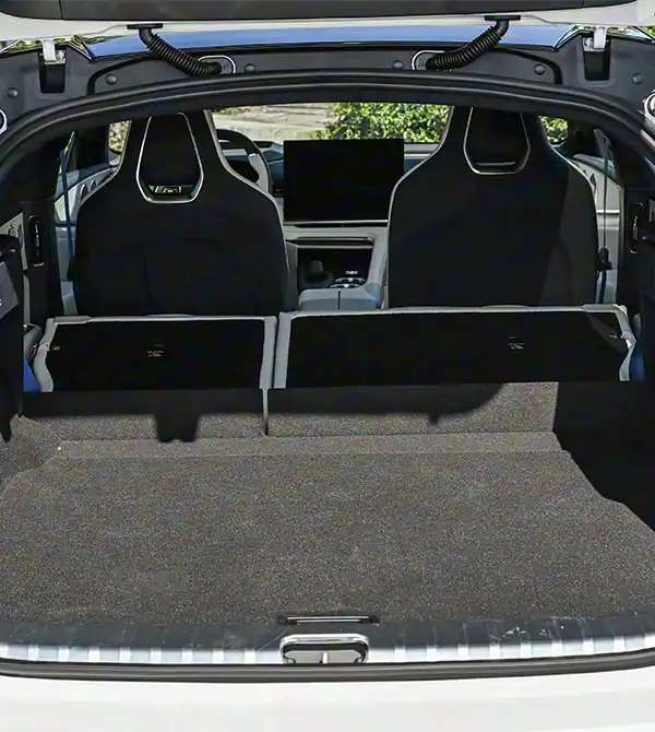 Na traseira, o Zeekr 001 combina desempenho e funcionalidade. O duplo aerofólio em fibra de carbono é o grande destaque: a seção superior canaliza o ar, enquanto a inferior melhora a estabilidade em alta velocidade. As lanternas LED contínuas possuem efeitos dinâmicos, e a luz de travagem integrada ao aerofólio garante visibilidade extra. O difusor inspirado na F1 e os detalhes em preto reforçam o caráter esportivo. O porta-malas elétrico oferece 810 L de capacidade, expansível até 2144 L com os bancos rebatidos, ideal para transportar pranchas de esqui ou equipamentos de camping. A abertura chega a 2,1 m e possui função antiesmagamento e memória de altura.